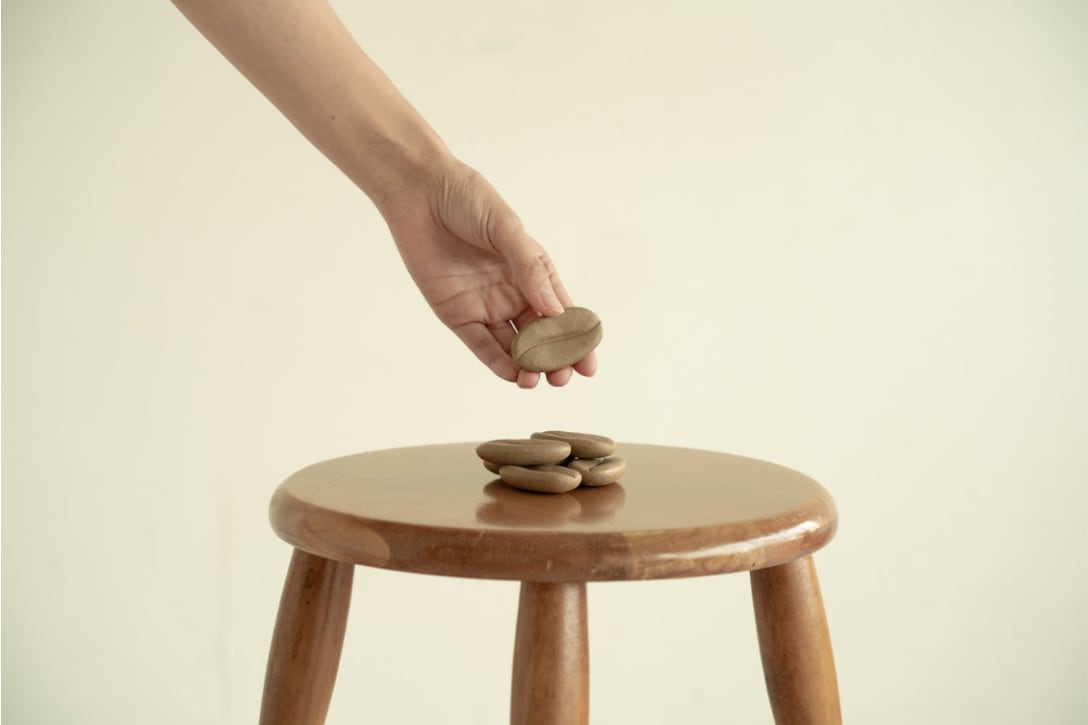 カップやタンブラーに入れるだけで、時間の経過とともにコーヒーの味わいをまろやかに変化させます。廃棄される備前焼を備前の粘土で練り戻し、新たな素材として採用。コーヒー豆の型に入れ、1つずつ手作業で仕上げています。生活に馴染むかわいらしいフォルムと、手軽に楽しめる味わいの変化をお楽しみください。